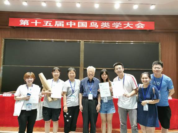 2019年8月7-8日,中国青年鸟类学家研讨会暨第十五届翠鸟论坛在长春举行。本次论坛由中国动物学会鸟类学分会主办,东北师范大学yl23455永利集团承办。来自全国27个高校、科研院所的130 余名硕士和博士研究生参加了本次论坛。经参会同学和与会专家共同投票选举,本次会议共评选出5个“金翠鸟”奖、8个“银翠鸟”奖、5个“优秀短报告”奖和7个“优秀墙报”奖。yl23455永利集团鸟类研究组共有12名硕士研究生参加了本次论坛,有4位同学获奖,其中董飞同学荣获“金翠鸟”奖,魏艳慧和张静同学荣获“优秀短报告”奖,张丽同学荣获“优秀墙报”奖,在全国性学术会议上获奖的档次和人数创学院历史新高。原中国鸟类学会理事长郑光美院士在随后举行的第十五届中国鸟类学大会闭幕式上为获得“金翠鸟”奖的5位同学亲自颁发了获奖证书。