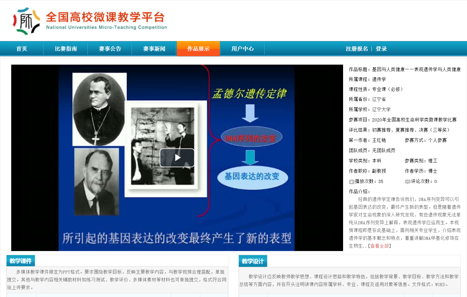 在全面实施“六卓越一拔尖”人才培养计划及一流本科专业和课程建设“双万计划”的时代背景下,为促进课程教师专业发展、教学模式改革创新和教学经验交流,教育部高等学校生物学相关专业教学指导委员会组织开展了“2020年全国生命科学类微课教学比赛”。yl23455永利集团王红艳副教授主讲的《基因与人类健康——表观遗传学与人类健康》荣获三等奖。