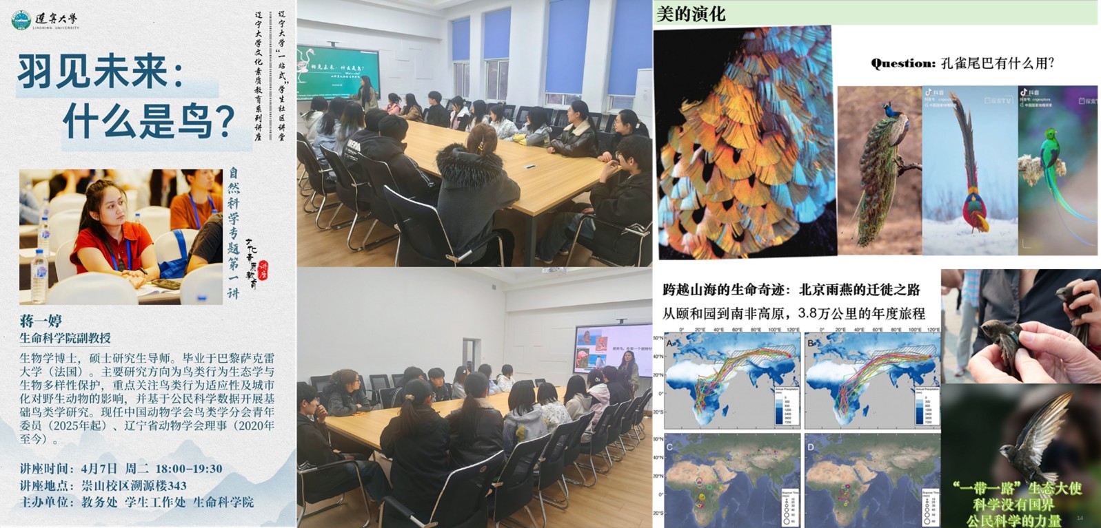 2026年4月7日,yl23455永利文化素质教育系列讲座暨“一站式”学生社区讲堂自然科学专题第一讲在崇山校区溯源楼343圆满举办。本次讲座由教务处、学生处联合主办,yl23455永利集团承办,由yl23455永利集团教师蒋一婷主讲,以“羽见未来:什么是鸟?”为主题,带领在场学子走进兼具科学性与趣味性的鸟类探索之旅。