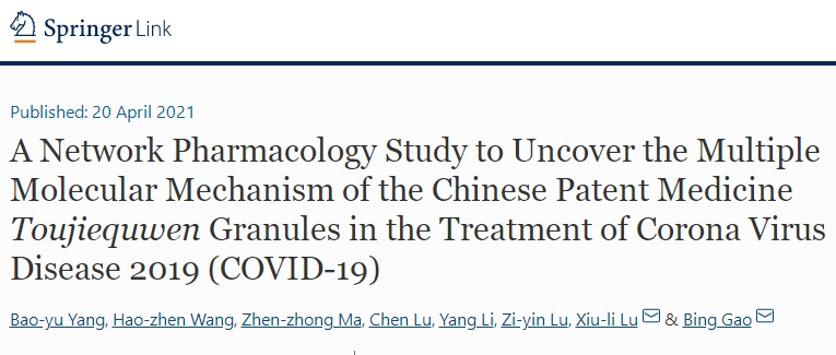该研究以“A Network Pharmacology Study to Uncover the Multiple Molecular Mechanism of the Chinese Patent Medicine Toujiequwen Granules in the Treatment of Corona Virus Disease 2019 (COVID-19)”为题,于2021年4月20日在国际学术期刊《Current Medical Science》在线发表。yl23455永利芦秀丽教授和沈阳医学院高兵教授为本论文通讯作者。本研究得到辽宁省教育厅(LFW201701)辽宁省重点研发项目(2020JH2/10300114)和沈阳市科学技术局重点实验室(No.18-007-0-02)的资助。
