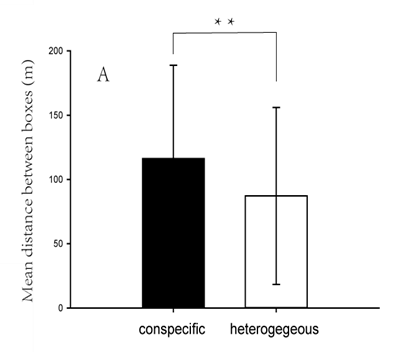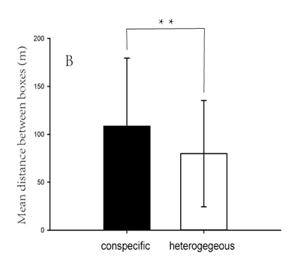 图1 A.杂色山雀种内和种间繁殖巢的平均距离